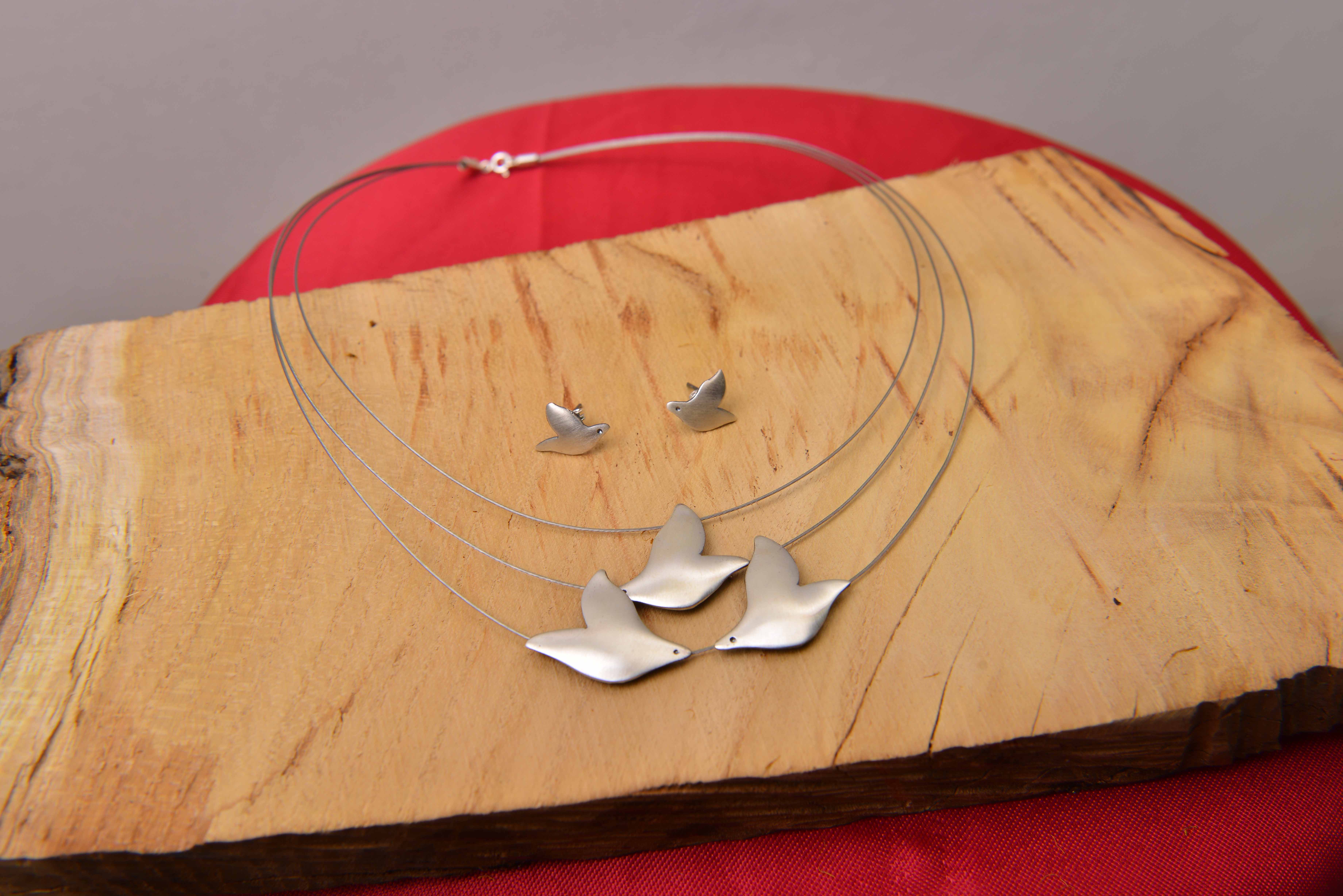 Özel Tasarım Üç Sıralı El İşi Çelik İpli Kuş Model Gümüş Küpe ve Kolye