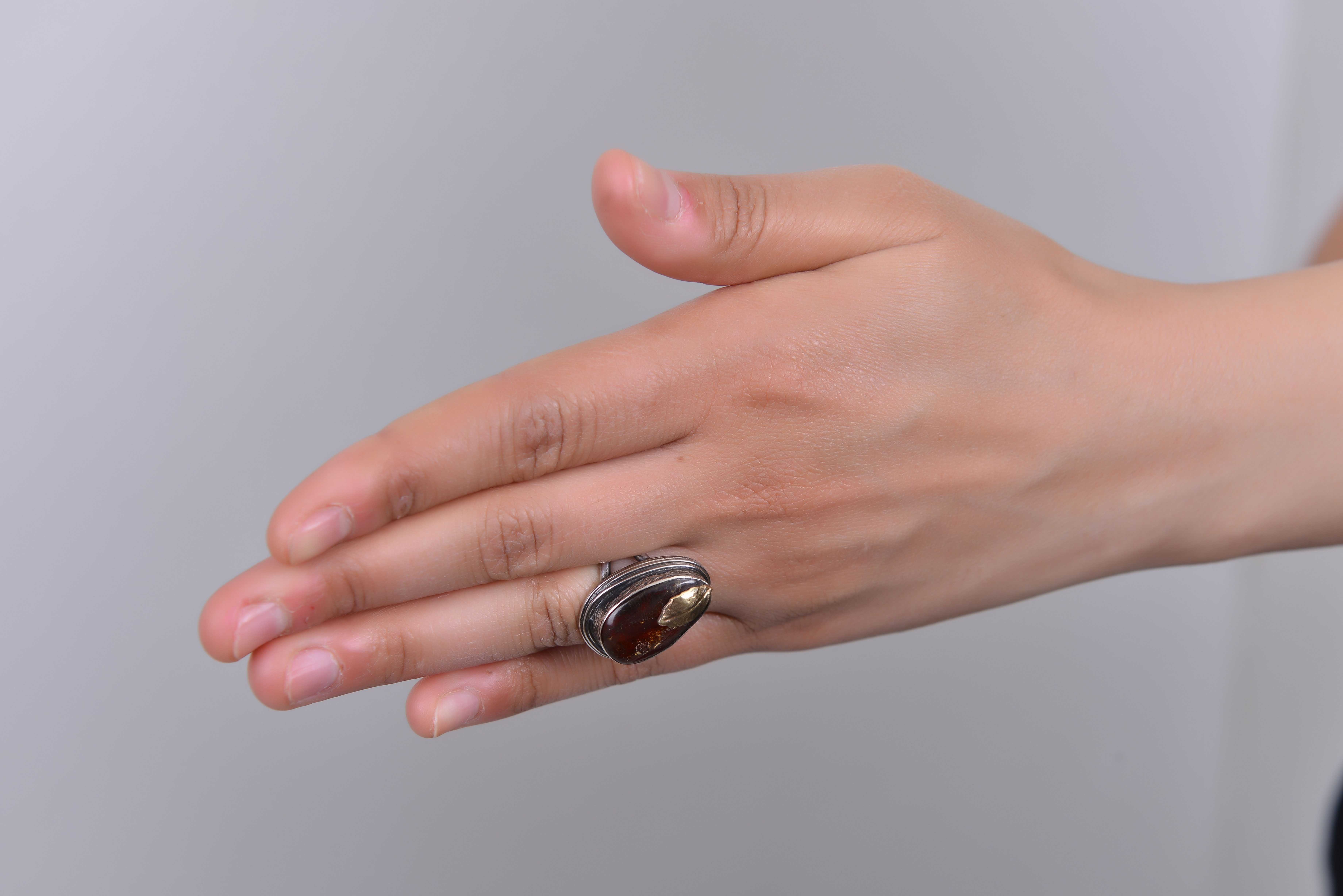 Kadın Elişi Doğal Damla Kehribar Otantik Özel Tasarım 925 Ayar Oksitli Gümüş Yüzük